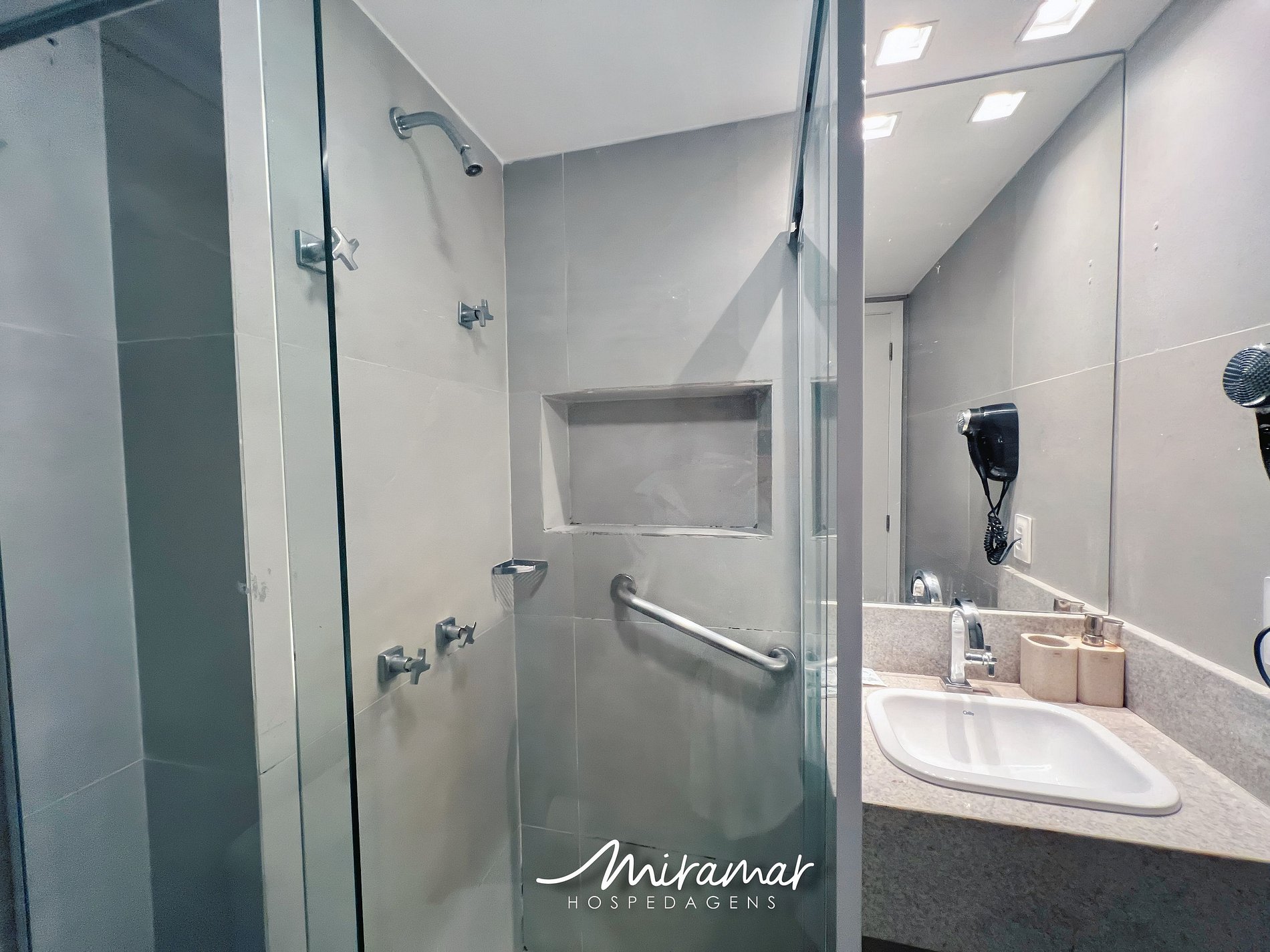 O apartamento possui banheiro privativo, equipado com barra de apoio no box e secador de cabelo, oferecendo mais comodidade durante a estadia. Ideal para quem deseja aproveitar dias tranquilos perto do mar, em uma localização prática e muito bem situada.
